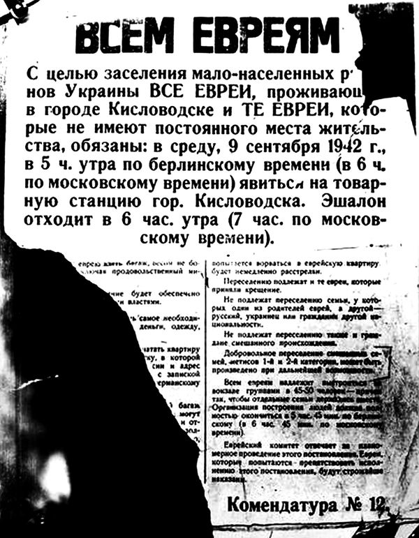 Rozkazem vojenského velitele města č. 12 ze 7. září 1942 byli z Kislovodsku deportováni všichni Židé, kteří dostali příkaz shromáždit se 9. září 1942 na nákladním nádraží pod záminkou, že „za účelem osídlení řídce obydlených oblastí Ukrajiny“ budou jen přesídleni. Není pochyb o tom, že zdůvodnění deportace bylo pouze lstí, aby se lidé podvolili víceméně dobrovolně.