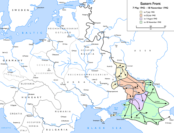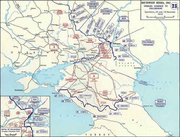 Mapa bojových operací na Kavkaze a v jižním Rusku v období od července do listopadu 1942
