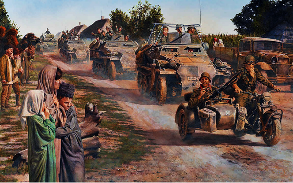Průzkumný oddíl Wehrmachtu projíždí kavkazskou vesnicí