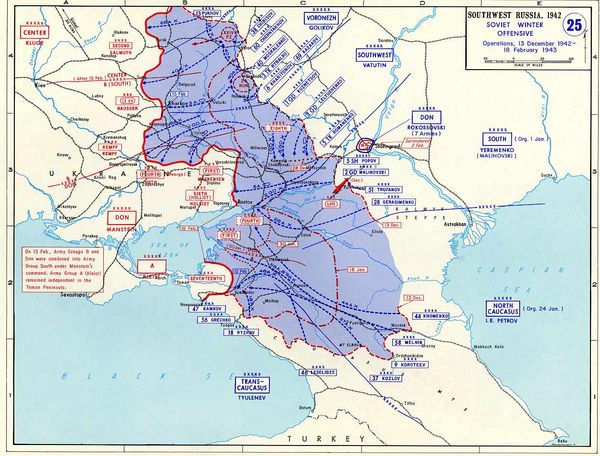 Mapa bojových operací na Kavkaze a v jižním Rusku v období od prosince 1942 do února 1943