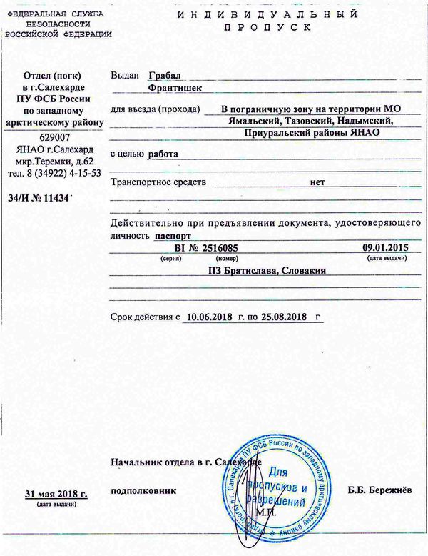 Propustka od FSB ke vstupu na Tajmyr_2018