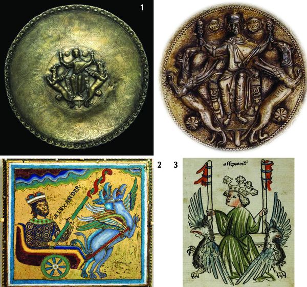 Ve 12.-13. století se toto vyobrazení Alexandra Velikého opět stalo populárním nejen v Byzanci, ale i v západní Evropě. Příkladem může být vyobrazení Alexandra putujícího oblohou v kočáře taženém dvěma modrými gryfy na jednom z uměleckých smaltů z poloviny 12. století[11] ze série známé jako Llangattock, která je mimořádně zajímavá jak technicky, tak ikonograficky (obr. 2), anebo kresba v manuskriptu Weltchronik Janse Jansena Enikela z r. 1272 (obr. 3).