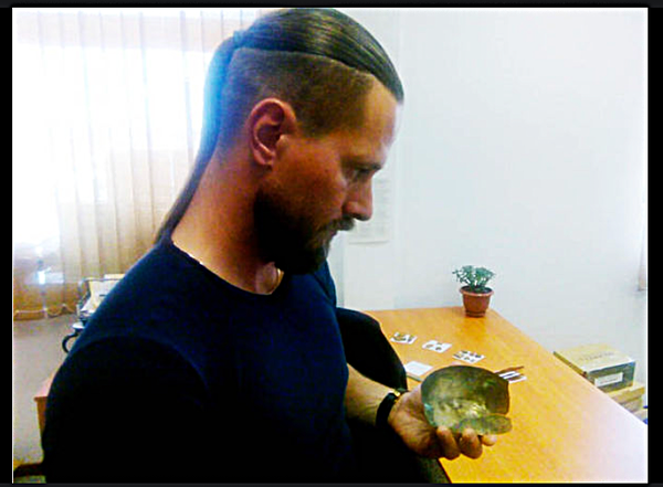 Anton Sinickij s miskou nalezenou jeho týmem na Gydanském poloostrově v srpnu 2016