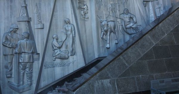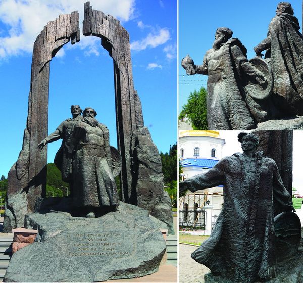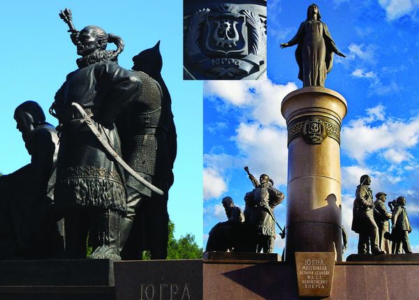 Na pozadí stylizovaného skalního oblouku jsou umístěny tři sochy zobrazující carského konkvistadora Ivana Mansurova[2], atamana Nikitu Pana[3]a chantského knížete Samara, symbolizující (údajnou) symbiózu původních obyvatel Sibiře a vyslanců ruského státu.