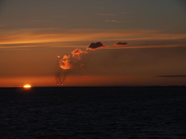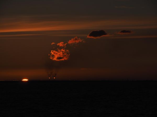 Západ slunce, na obzoru planou plynové „pochodně“ rafinérie - Novyj Port / Jamal