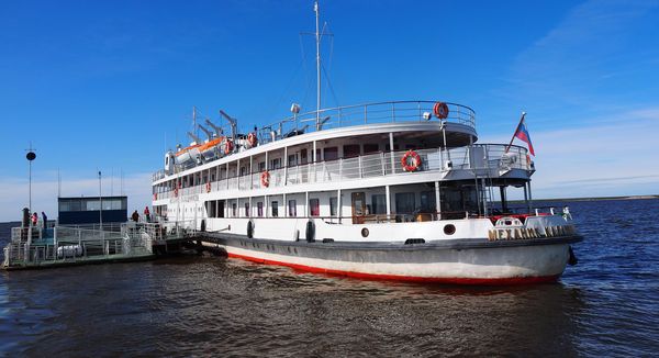 I pasažérské říční lodě musí kvůli mělkým pobřežním vodám kotvit daleko od břehu, u plovoucího mola, odkud cestující převáží na břeh čluny:
