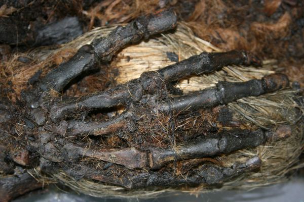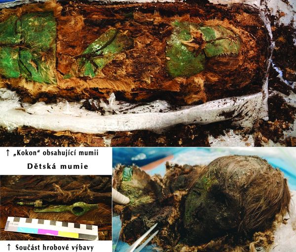 Při zběžném ohledání detektorem kovů a 3D skenování přenosným tomografem došli vědci ke zjištění, že schránka ukrývá jednak kovové předměty (zřejmě měděné či bronzové), jednak lidské ostatky. Během podrobného zkoumání v laboratoři se zjistilo, že schránka obsahuje mumii zhruba sedmiletého chlapce, pohřbenou s malou bronzovou sekerkou a zabalenou v několika vrstvách sobí kožešiny a s tělem pokrytým tenkými plátky mědi.