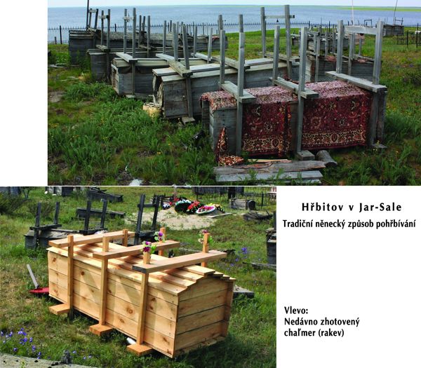 Jak ukazují nálezy starých něneckých pohřebišť na různých místech poloostrova Gydan a na dolním toku řeky Taz, typickou tradiční variantou pohřbívání u Něnců i Chantů bylo uložení mrtvých do obdélníkových beden (tzv. chaľmer) ze zhruba opracovaných prken. Na bocích byly tyto schránky zpevněny dvěma nebo třemi páry dřevěných latí, spojenými příčně dvěma nebo třemi prkny s vyřezanými otvory, skrze které tato byla na laťky nasunuta (případně místo toho k nim přibita hřebíky).[5] Tyto „sarkofágy“ nebyly uloženy do zmrzlé země, nýbrž pouze umístěny na rošt z několika fošen, tak jako je tomu dodnes na jamalském venkově.